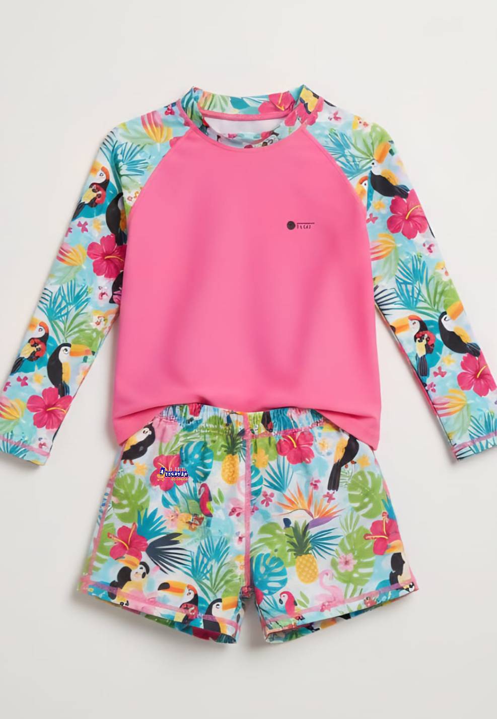 MODELO: Blusa + Short com detalhes estampados, ideal para praia, piscina, parques e brincadeiras ao sol, garantindo proteção e estilo em um único conjunto.