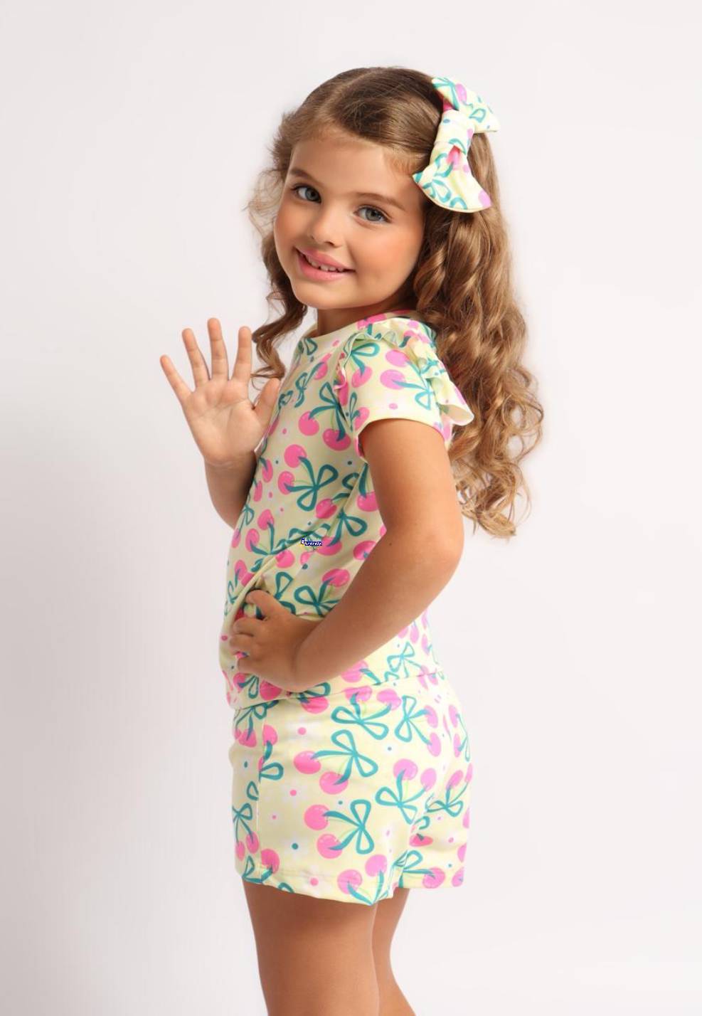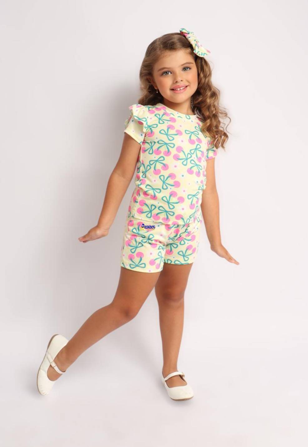 MODELO: Conjunto infantil delicado com detalhe em babadinhos, acompanhando laço de cabelo combinando, proporcionando um visual charmoso, confortável e cheio de estilo para as pequenas