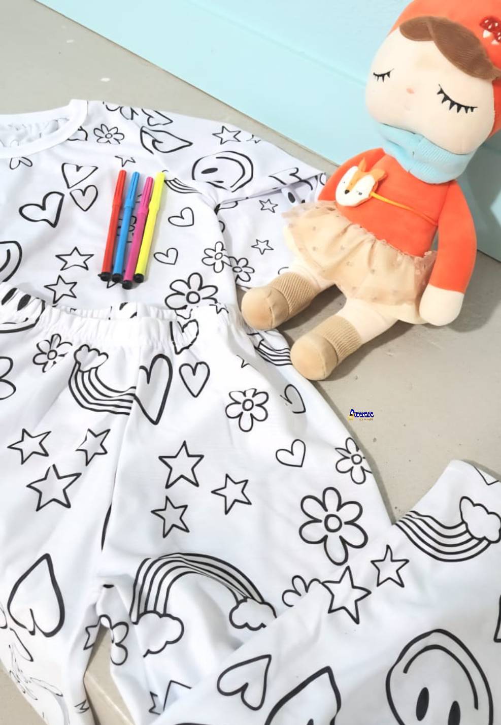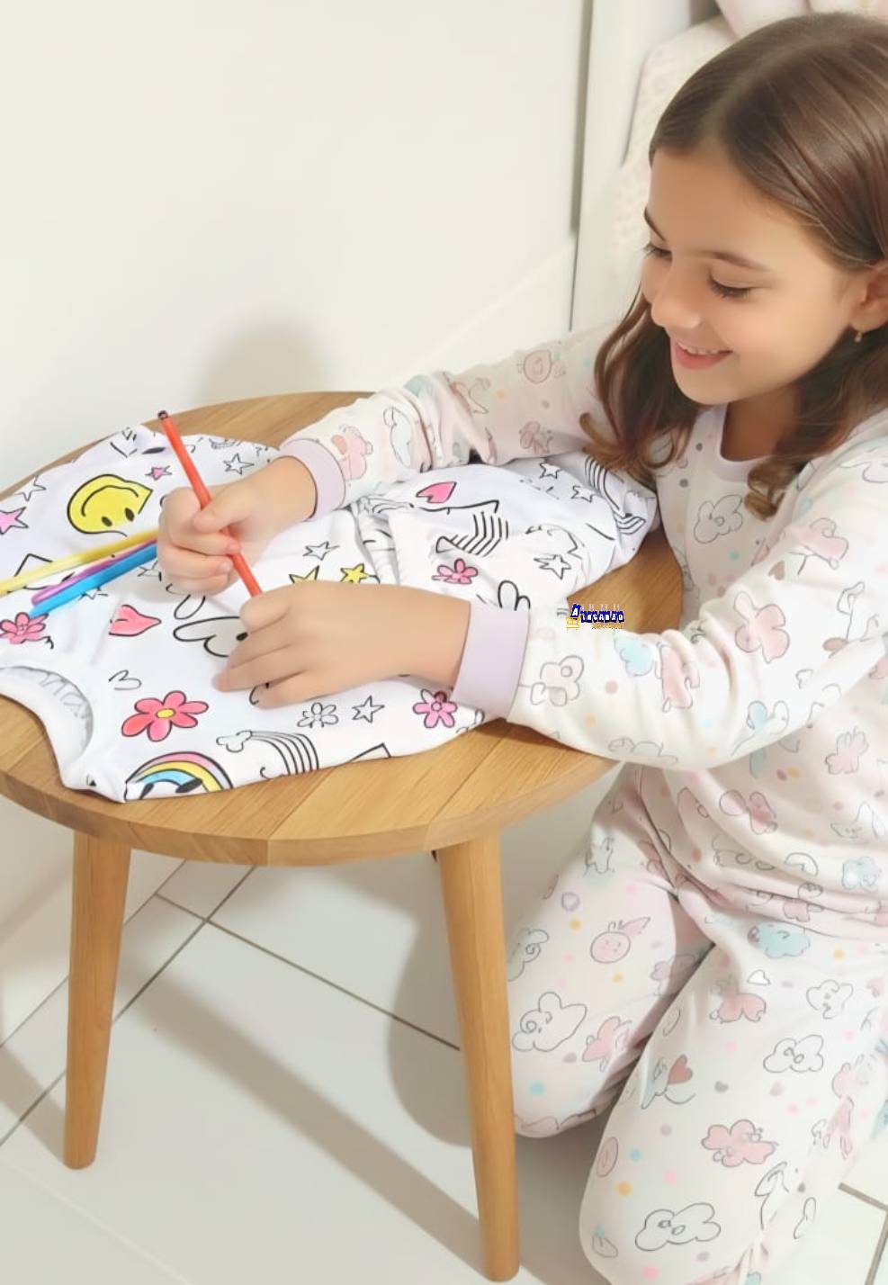 Diversão que veste! Pijama de colorir com canetinhas inclusas — a criança pinta, brinca e a tinta sai ao lavar!